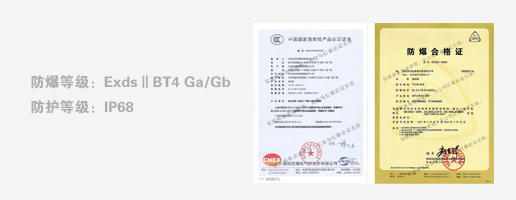 防爆等级Exds IIBT4 Ga/Gb级,质量管理体系符合并严格实施ISO9001标准、3C认证,生产流程经严格监督,产品出厂检验,保证每一款产品质量